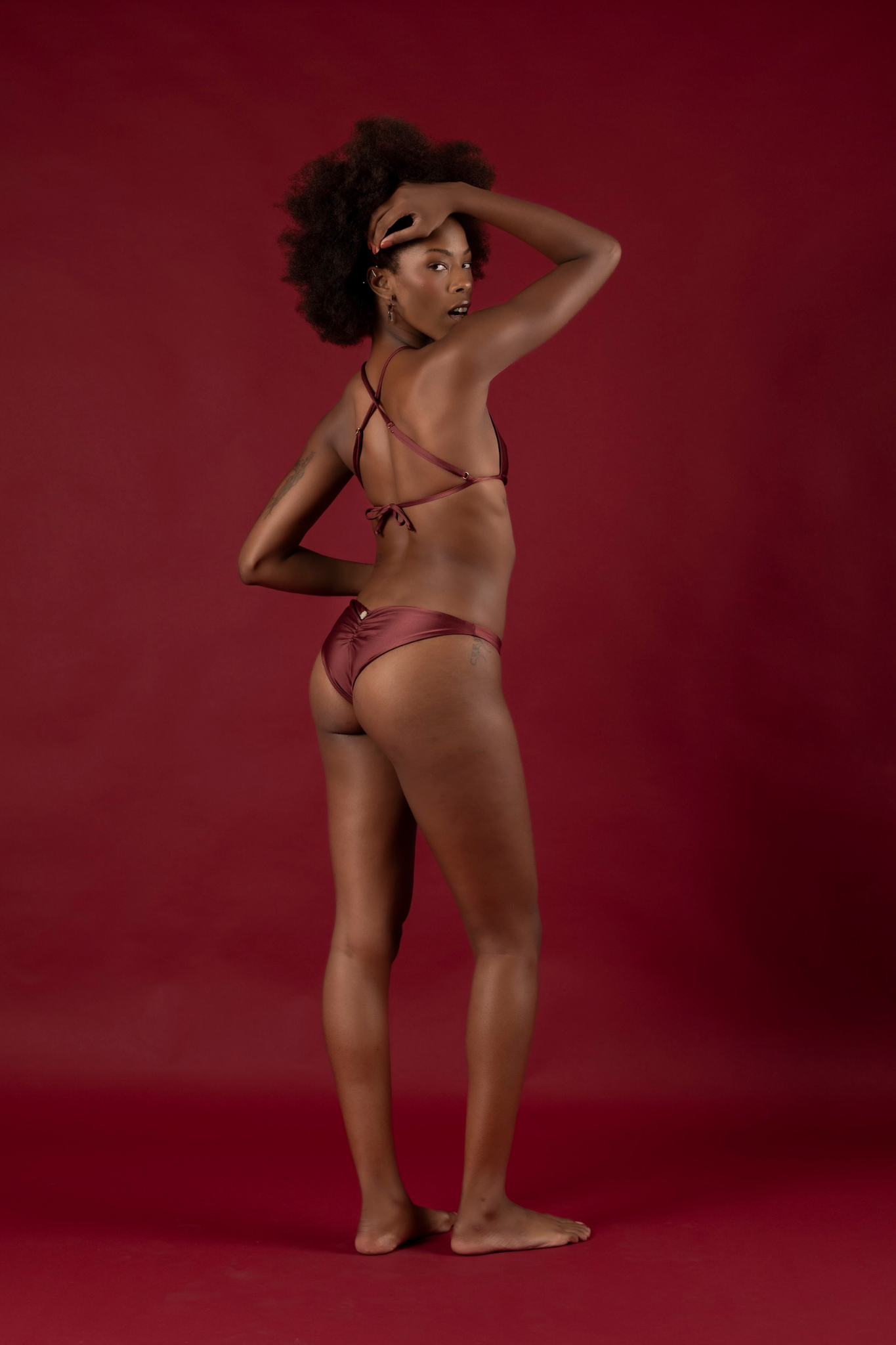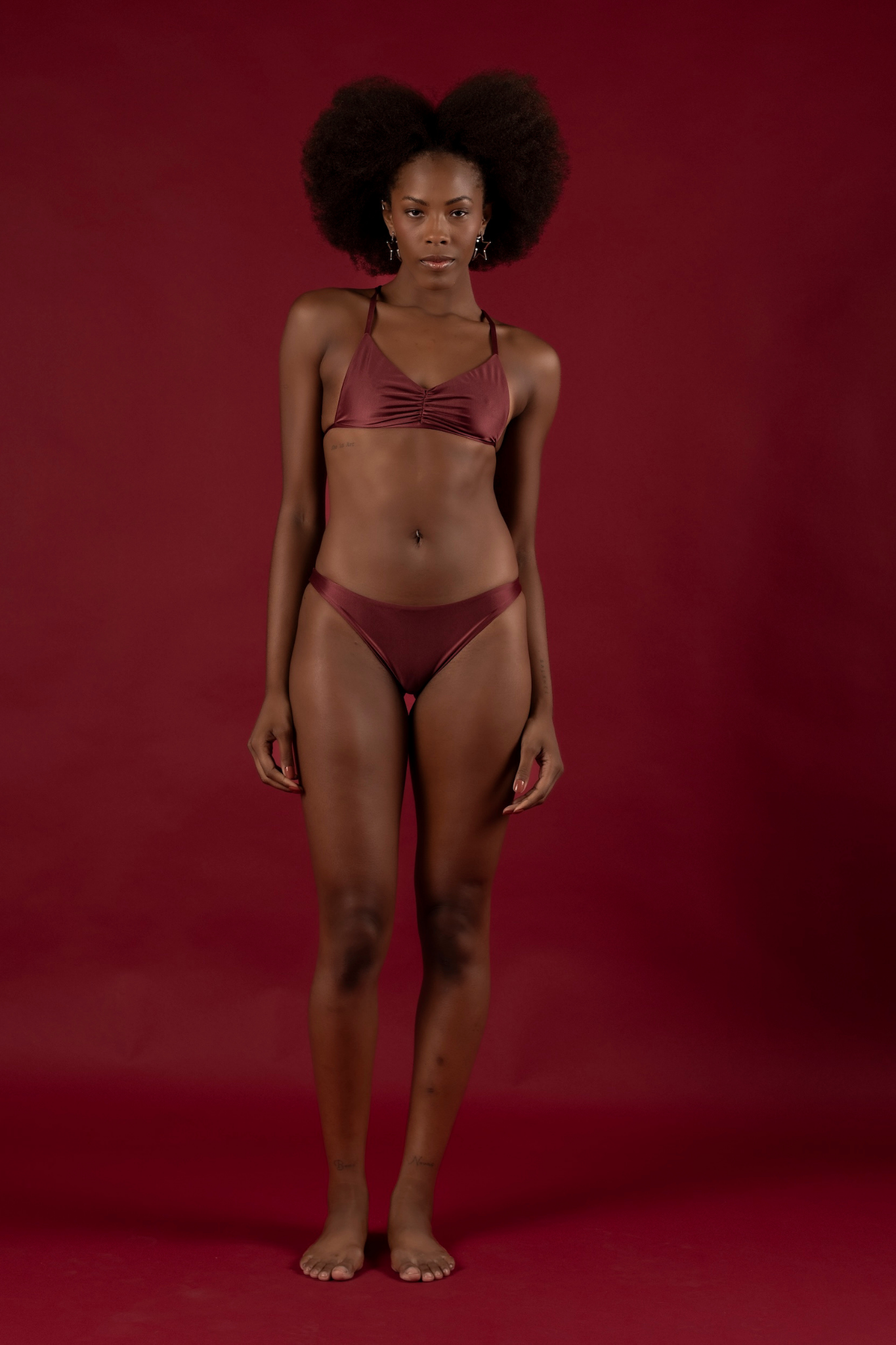 The basic bikini set is a stylish and functional choice for a sunny day at the beach or by the pool. Triangular top with crossed straps at the back, offering support and comfort. The straps are adjustable. Straight bikini bottom style with gathered "butt-lift" for natural curves and to provide a shaping effect.