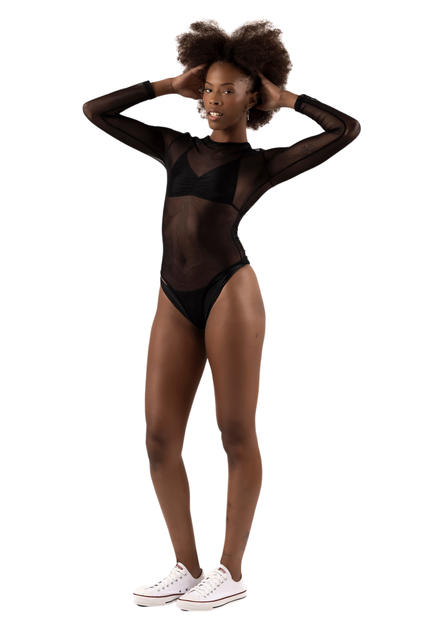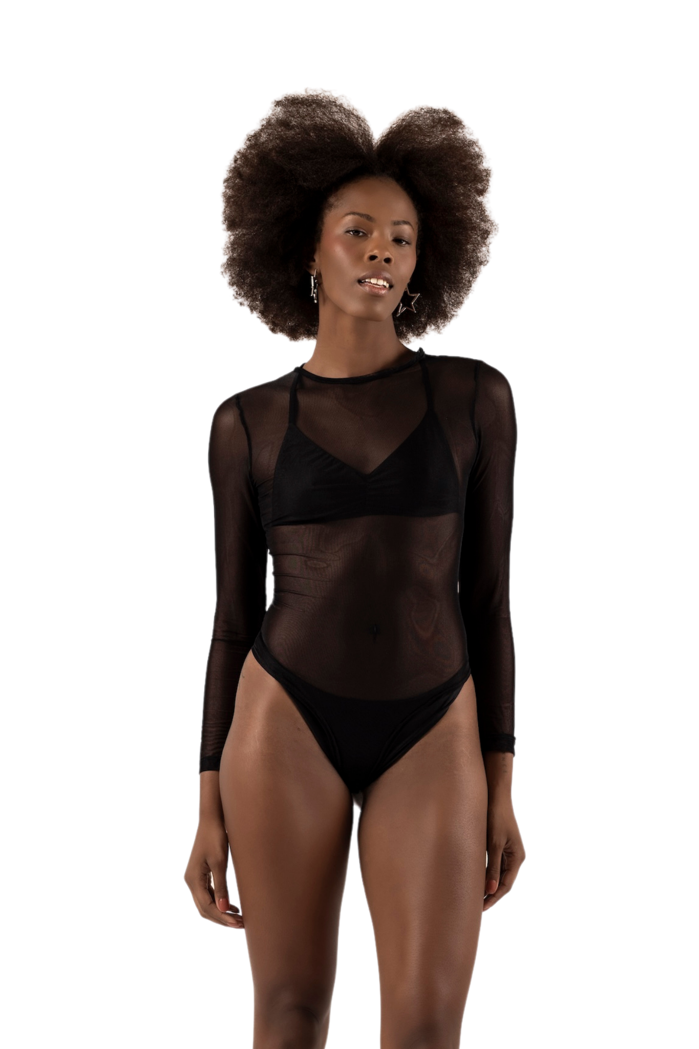Beautiful and basic black tulle bodysuit, sensual and sophisticated. A piece that combines elegance, charm, and self-confidence, the perfect choice for those seeking a bold and striking style.