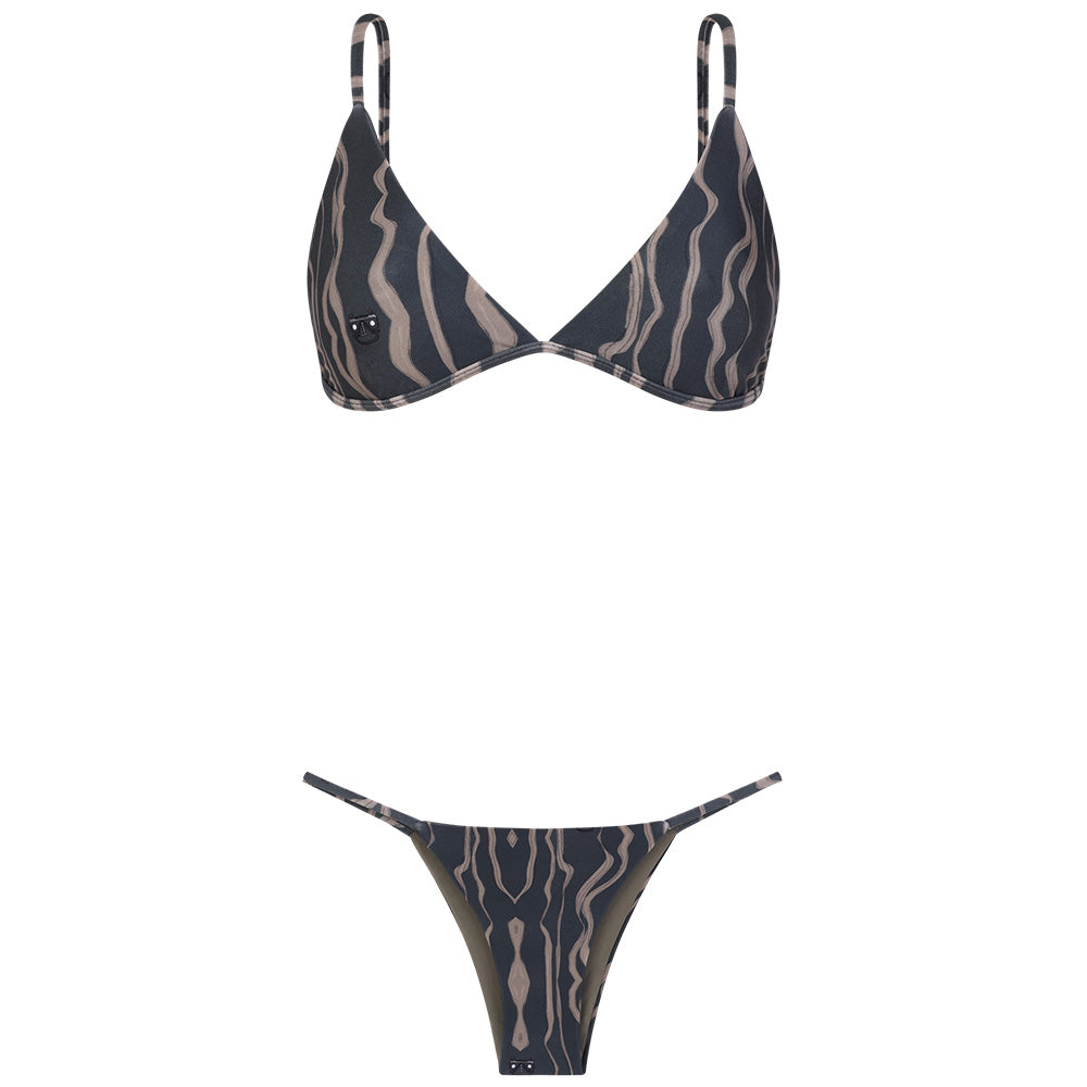 The top is a classic triangle design with adjustable straps, ensuring comfort and support. The minimalist design highlights its timeless elegance, while the adjustable back provides a perfect fit. The matching bottom features a simple and elegant cut with adjustable side ties that perfectly complement the top, creating a balanced and flattering look. Fully lined for added quality and comfort.