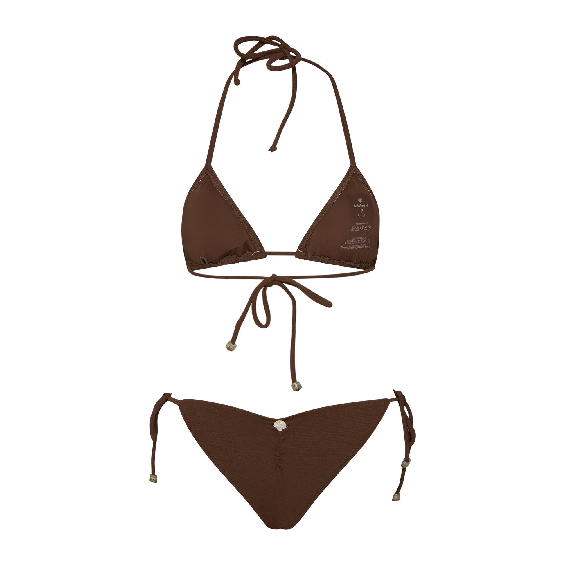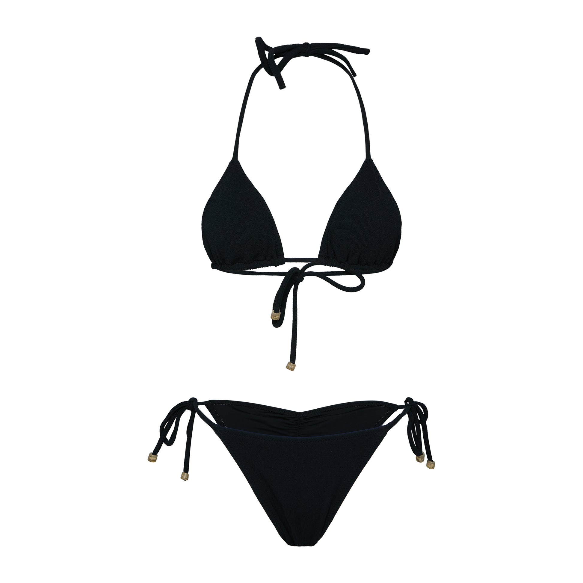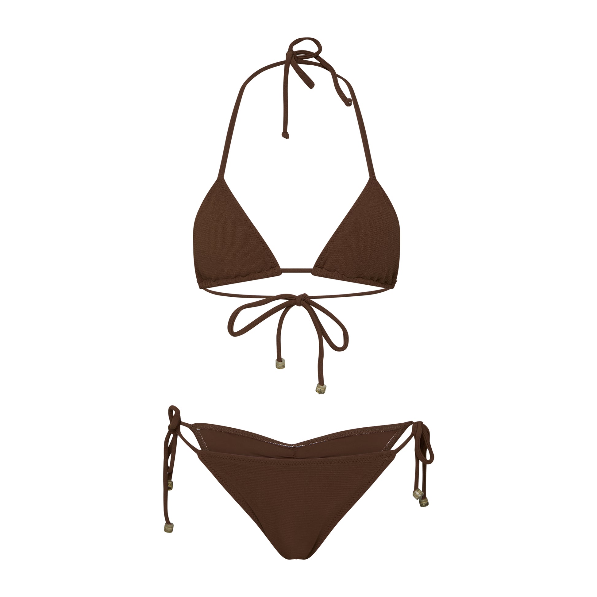 The Tina Bikini redefines the classic with comfort and ease. The triangle top features removable padding and full lining, providing support and lightness in every detail. The bottoms, with ruched sides, are designed to fit without tightening or marking the skin, offering a natural and elegant silhouette.