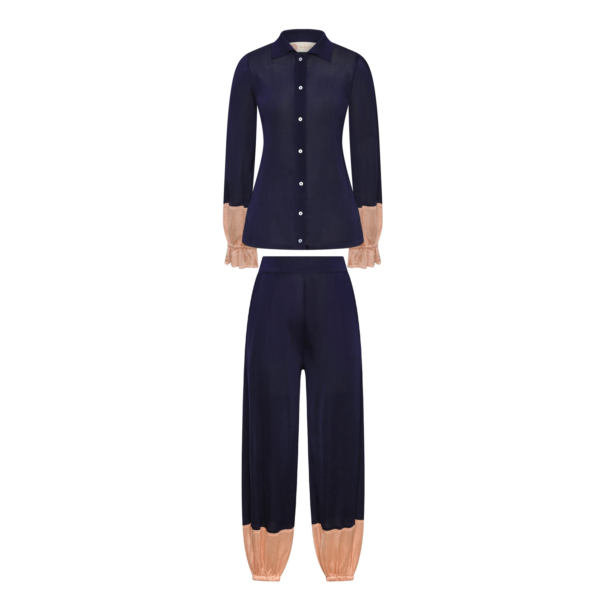 The wide-leg pants with an elastic waistband offer freedom and a flawless drape, while the long-sleeve shirt with defined cuffs adds a refined and versatile touch. Worn together or separately, the pieces create a harmonious look with effortless presence.