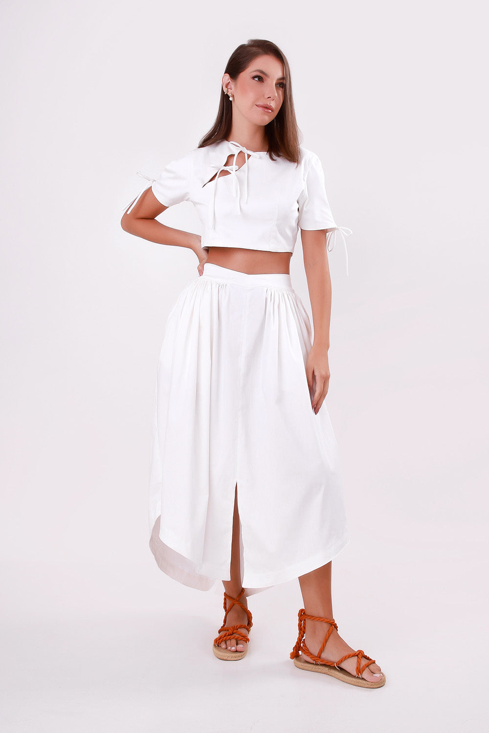 - Style: High-waisted asymmetric skirt with an abstract print in earthy tones.