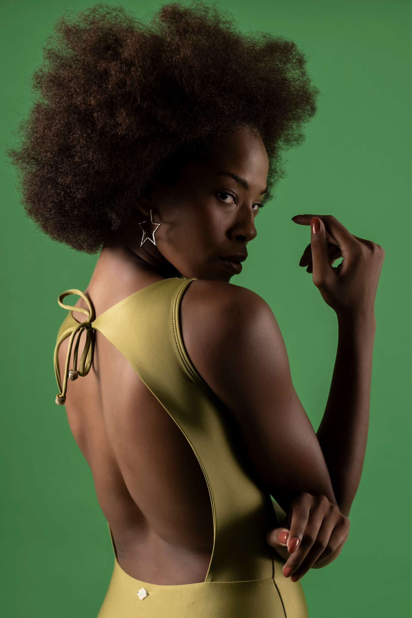 A flattering one-piece bathing suit, great to be worn from beach street by doubling as a bodysuit. High neckline, Back tie closure, Open back; A flattering one-piece bathing suit, great to be worn from beach street by doubling as a bodysuit. High neckline, Back tie closure. Open back.