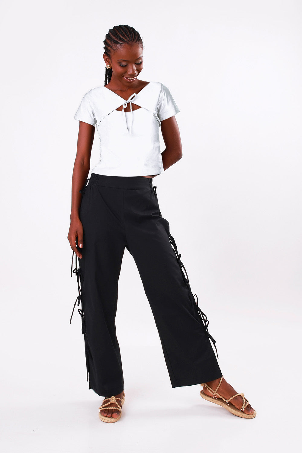 This stylish top features a fitted silhouette with a unique cutout at the neckline, enhanced by a bow detail. The back has an elegant U-neckline, and the top includes short sleeves, combining elegance with a touch of playful charm.
