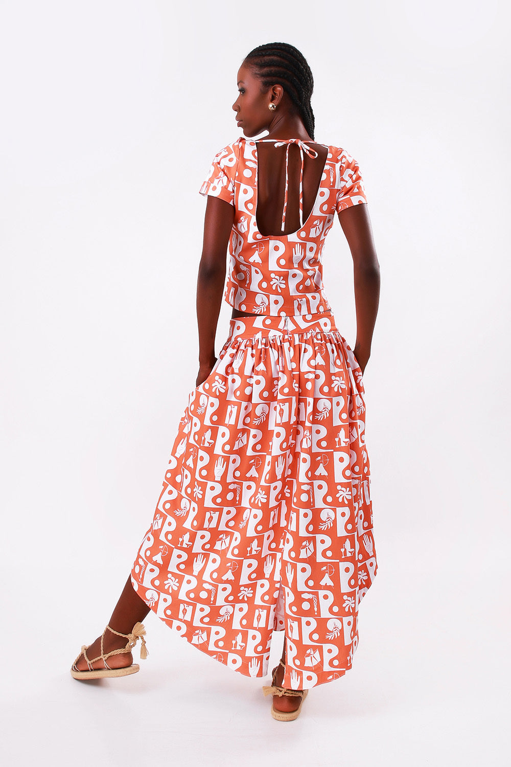 - Style: Fitted top with neckline cutout and bow detail, short sleeves, and U-neckline at the back.